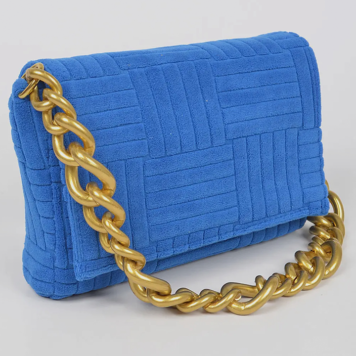 Get ready for summer with our Blue Terry Clutch! Made from soft terry cloth, this clutch features a stylish gold link chain, making it the perfect accessory for any summer outfit. Say goodbye to bulky bags and hello to effortless style.