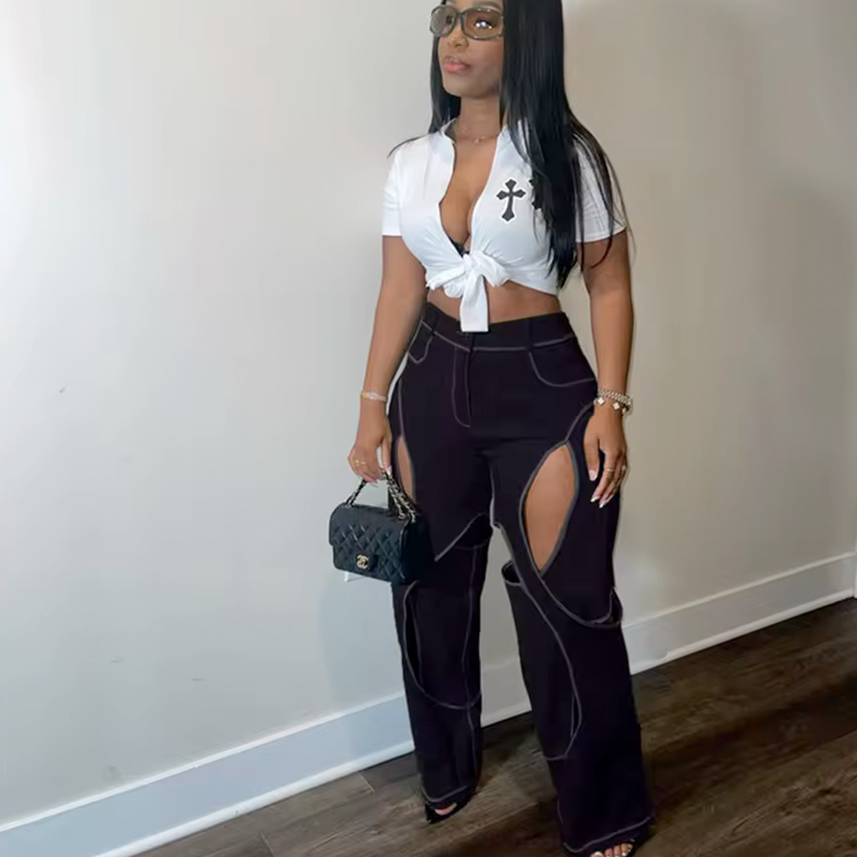 Made from a stretchy blend of spandex and polyester, these pants offer ultimate comfort and style. Side pockets and cut out detailing add a touch of edge. Perfect for any adventure, these pants will have you feeling confident and cool.