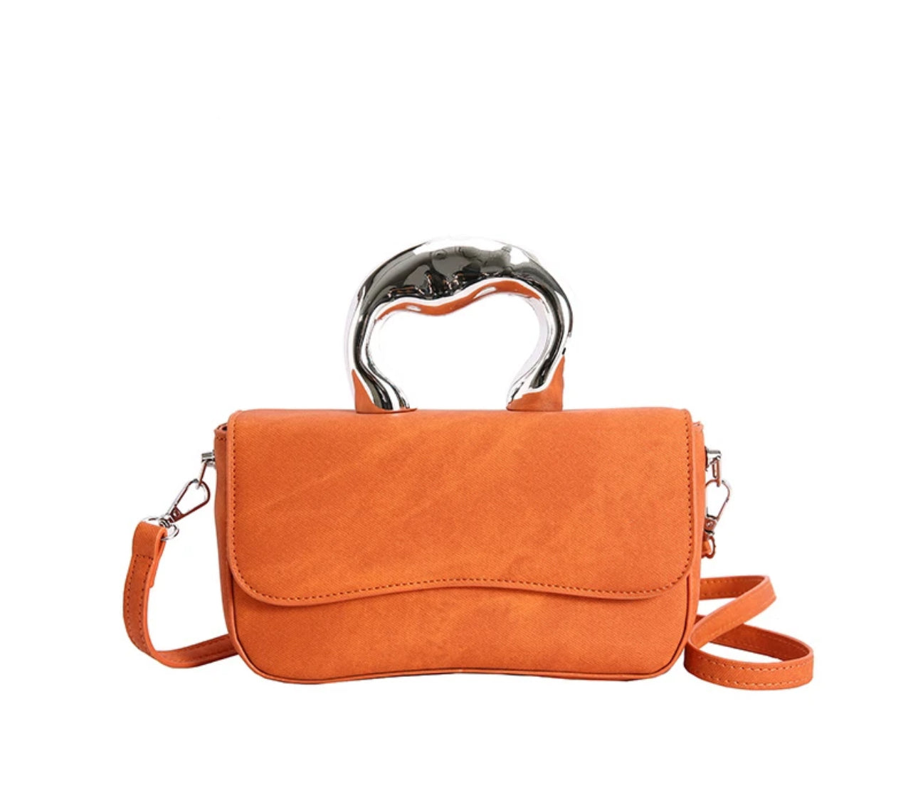 The soft textured metal silver handle adds a touch of sophistication to this playful, orange bag. Effortlessly combine fashion and function with this quirky accessory.