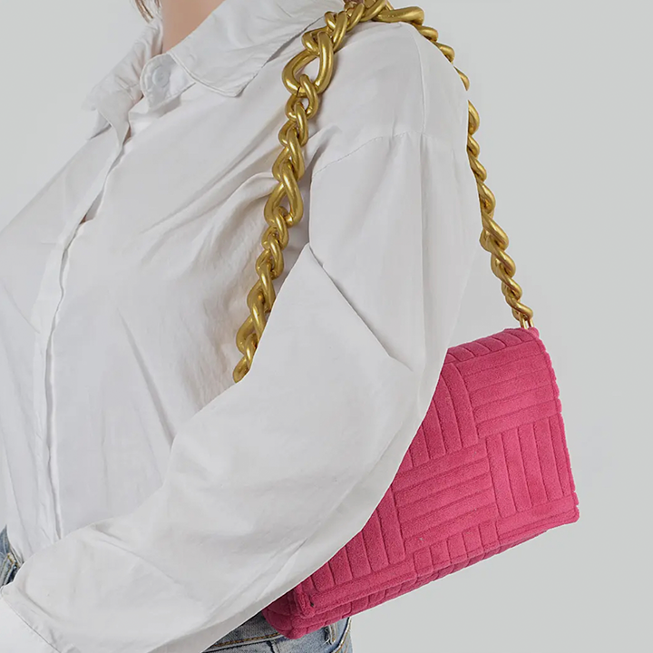 Get ready for summer with our Pink Terry Clutch! Made from soft terry cloth, this clutch features a stylish gold link chain, making it the perfect accessory for any summer outfit. Say goodbye to bulky bags and hello to effortless style.